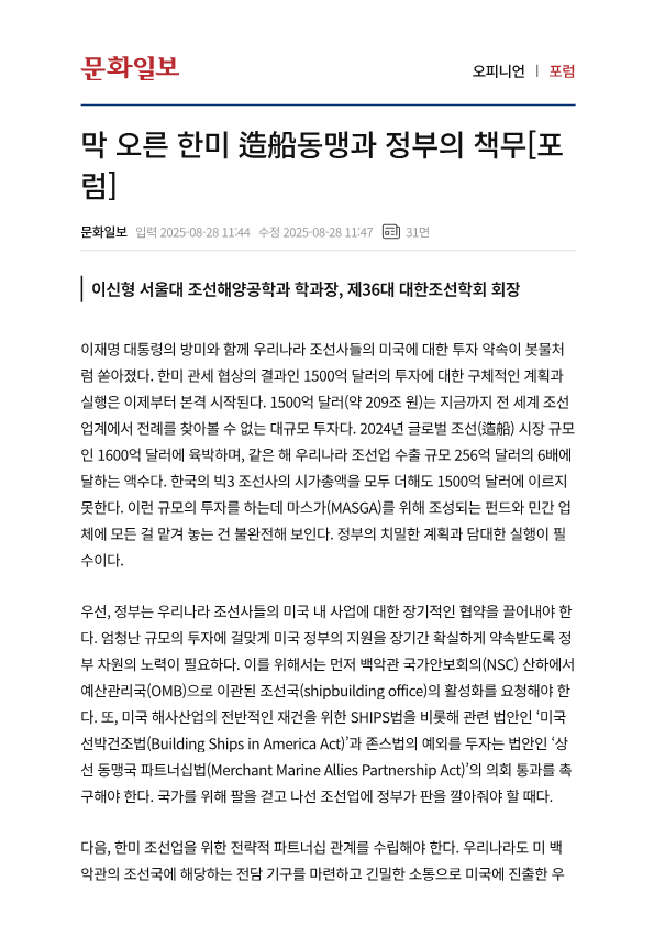 “막 오른 한미 造船동맹과 정부의 책무” 라는 주제로 문화일보에 교수님께서 기고하신 글입니다.