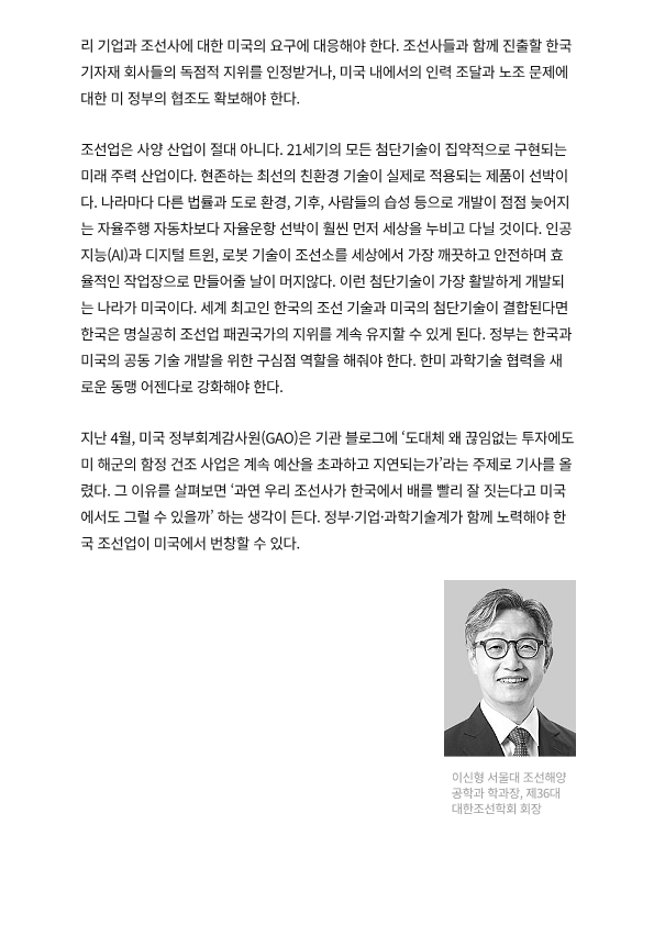 “韓조선업, 해양 재건 나선 美와 전략적 파트너십을”라는 주제로 동아일보에 교수님께서 기고하신 글입니다.